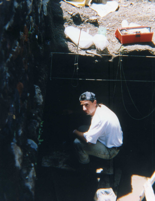 Revisando sondeo en excavación arqueológica de Teotihuacán-La Ventilla (México). Colaboración arqueológica con INAH. Foto A. Alagón ARQUEOPLUS.
