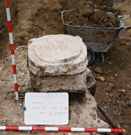 Arqueología en Huesca. Foso ibero-romano de Huesca. Excavación arqueológica. Basa de columna. Antonio Alagón. ARQUEOPLUS ©